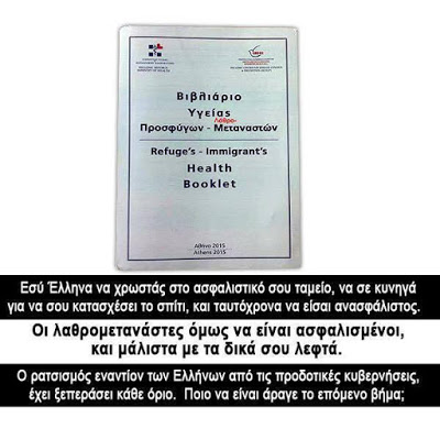 Ρατσισμό κατά των Ελλήνων καταγγέλλουν άνεργοι, φτωχοί και εξαθλιωμένοι Έλληνες με αφορμή την παροχή τροφής, στέγης, κλιματισμού και περίθαλψης στους πρόσφυγες που κατέκλυσαν τη χώρα: “Είμαστε Έλληνες που χρωστάνε στην εφορία, στο ταμείο, στο μπακάλη, στο μανάβη, στο χασάπη, είμαστε ανασφάλιστοι, δεν έχουμε θεωρημένο βιβλιάριο υγείας. Την ίδια στιγμή, χορηγείται περίθαλψη σε μετανάστες με τα ΔΙΚΑ ΜΑΣ ΛΕΦΤΑ”